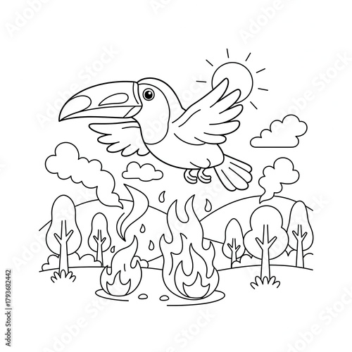 © SetCartoon, Obraz premium Toucan flies over a wildfire with trees and smoke