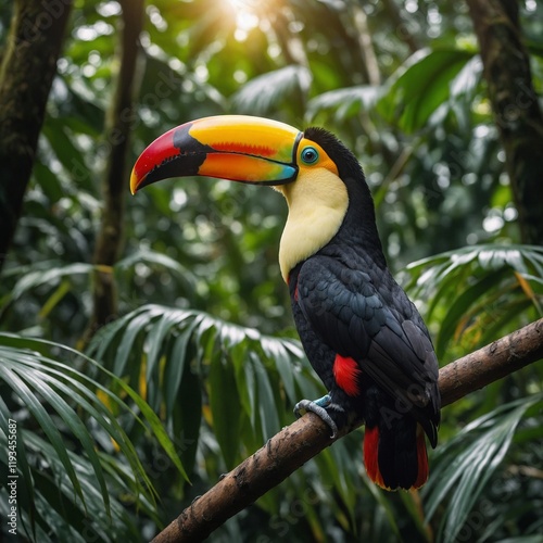 Naklejka premium toucan on a branch a toucan sitting on a tree branch Rainforest Biodiversity, Rich, colorful images of rainforest flora and fauna, emphasizing the need to protect these vital ecosystems