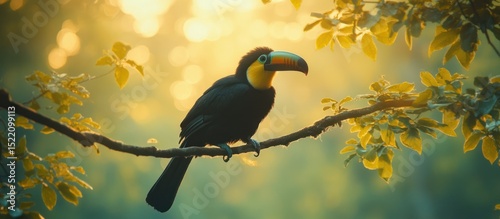 © GoDress, Fototapeta premium Toucan perched on a branch at sunrise in a lush forest.
