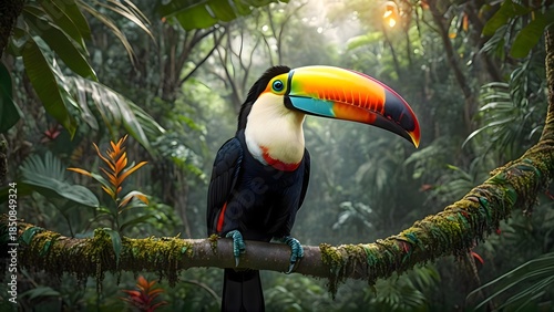 Obraz premium Toucan perched on a branch inside dense jungle vegetation, tropical wildlife...