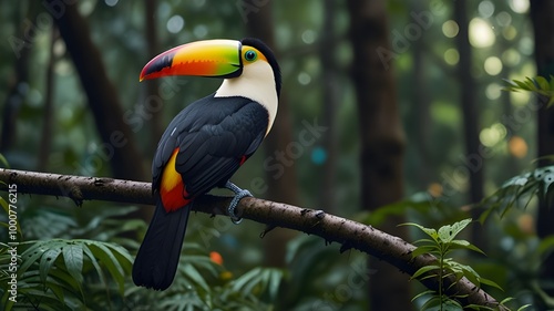 © Ghulam, Naklejka premium Toucan sitting on the branch in the forest, green vegetation, full of copy space, colorful wallpaper Generative AI