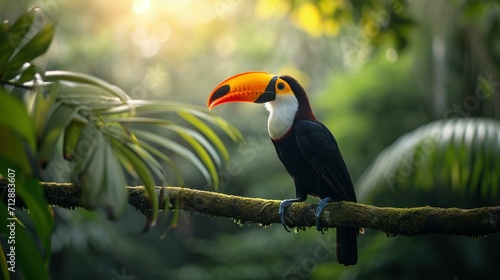 Naklejka premium Toucan tropical bird sitting on a tree branch in natural wildlife environment in rainforest jungle