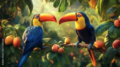 © cllareta, Obraz premium Toucans in Tropical Fruits Tree, Close-Up View, Peaceful Scene, Nature Photo