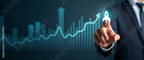 © Netaya, Obraz premium Touch virtual rocket icon up arrow push new startup forward accelerate strategic plan secure business growth innovation fosters success concept as Businessman highlights rocket symbol quick upward mot