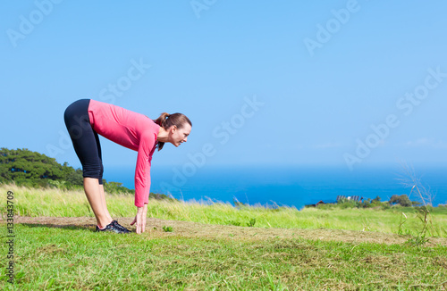 © kieferpix, Fototapeta premium Touch your toes exercise.Young fit woman doing leg and back stretch.
