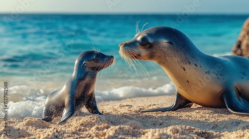 © lipur, Fototapeta premium Touching moment: endearing sea lion pup greets its mother on the shore