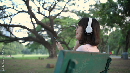 © S photographer, Naklejka premium Tourism concept. An Asian woman is listening to music in the park. 4k Resolution.