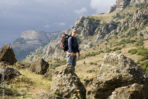 © Alexey Fursov, Fototapeta premium tourist at mountains
