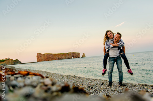 Fototapeta premium tourist couple enjoying Perce Rock view from Gaspe in Quebec