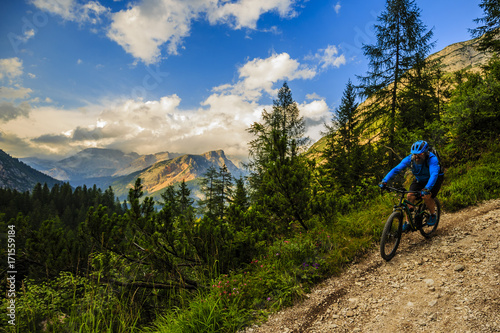 Fototapeta premium Tourist cycling in Cortina d'Ampezzo, stunning rocky mountains on the background. Man riding MTB enduro flow trail. South Tyrol province of Italy, Dolomites.