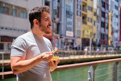© Ladanifer, Obraz premium Tourist eating takoyaki at Dotonbori canal in Osaka, Japan.