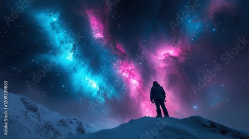 © Iurii, Fototapeta premium Tourist gazes at magnificent nebula through telescope on snowy mountain
