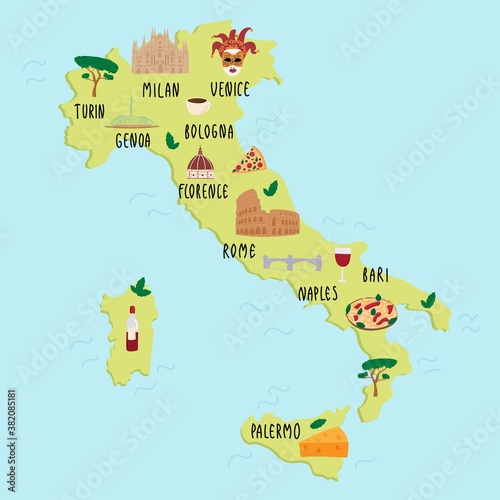 © Анастасия Красавина, Fototapeta premium Tourist infographics about America. National symbols. Famous attractions. Cartoon map with Italian temples, dishes, trees. Colored vector illustration.