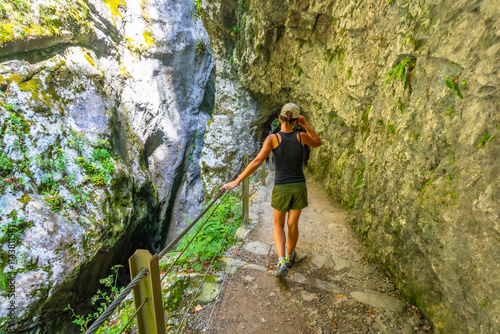 Fototapeta premium Tourist walking down tolmin gorges canyon in slovenia during summer