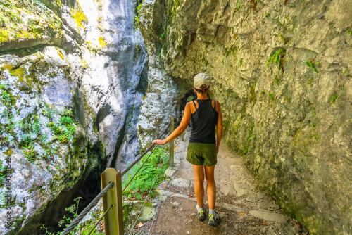 Fototapeta premium Tourist walking in tolmin gorges in slovenia during summer