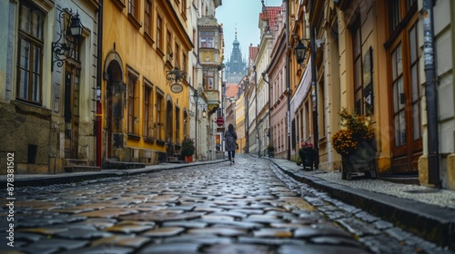 Fototapeta premium tourist walking on a cobblestone street with historic buildings on both sides...