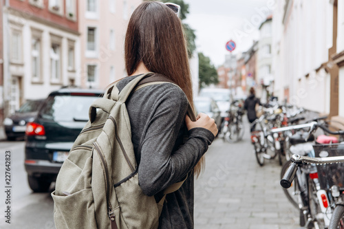 Fototapeta premium Tourist with a backpack is looking for booked online accommodation in an unfamiliar city. Or a student girl with a backpack is walking through the city.