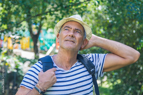 © tetxu, Obraz premium tourist with backpack walking through the countryside
