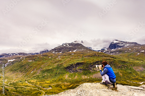 © Voyagerix, Naklejka premium Tourist with camera in Norway mountains