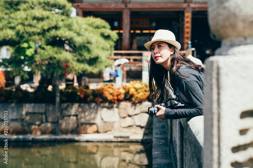 © PR Image Factory, Fototapeta premium tourist with straw hat standing above the pond