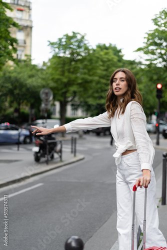 Fototapeta premium Tourist with suitcase catching taxi near road on street in Paris.