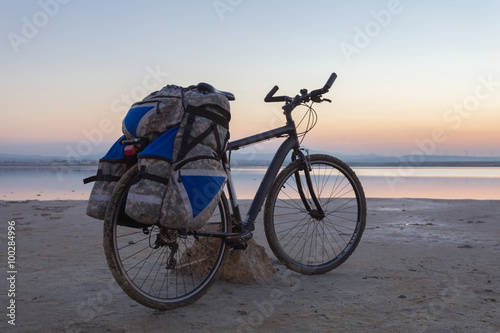 © Yuriy Kulik, Obraz premium touristic bicycle stay on a lake coast