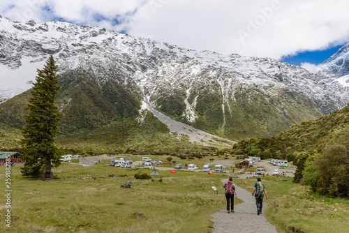 Naklejka premium Tourists are returning to the base camp after walking along the Hooker Valley Track
