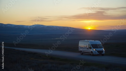 © Sakiyah, Fototapeta premium Tourists Driving Rental Camper Van at Sunset