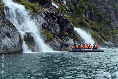 © b201735, Fototapeta premium Tourists from the cruise ship near the waterfalls of the glacier Nena.