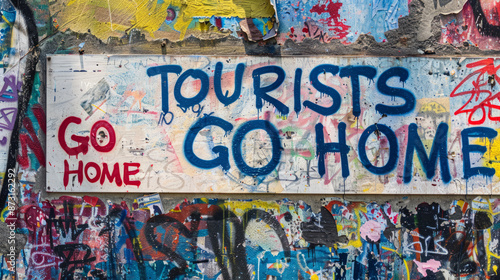 © ink drop, Fototapeta premium Tourists go home graffiti on a wall. Anti tourist message. Generative ai