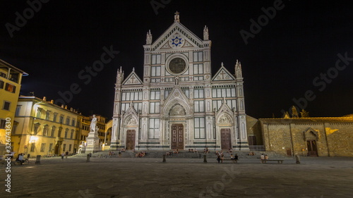 Fototapeta premium Tourists on Piazza di Santa Croce at night timelapse with Basilica di Santa Croce Basilica of the Holy Cross in Florence city.