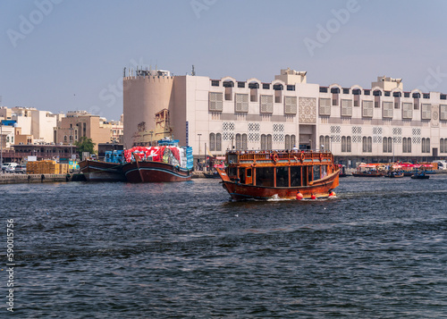 Obraz premium Tourists touring the Creek from Bur Dubai to Deira on a traditional dhow boat