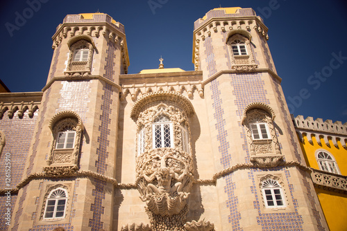 © Valmir Fernando, Fototapeta premium Tower and detailed facade of Pena Palace under bright blue sky.