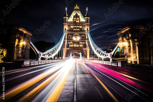 © A to Z, Fototapeta premium Tower bridge at night with light trails left by a passing double-decker bus, London, England, United Kingdom