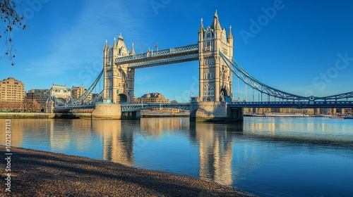 Obraz premium Tower Bridge, London, UK, with a clear blue sky and a reflection in the water.