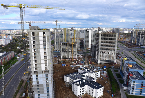 © MaxSafaniuk, Fototapeta premium Tower crane during construction of a residential building. Cranes on formworks. Construction the building or multi-storey homes, Arial view. Renovation concept. Realtor and Real Estate