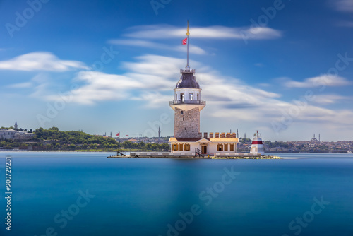 Fototapeta premium Tower like lighthouse on island in sea Postcard view Blurred clouds, smooth water, Istanbul, Turkey