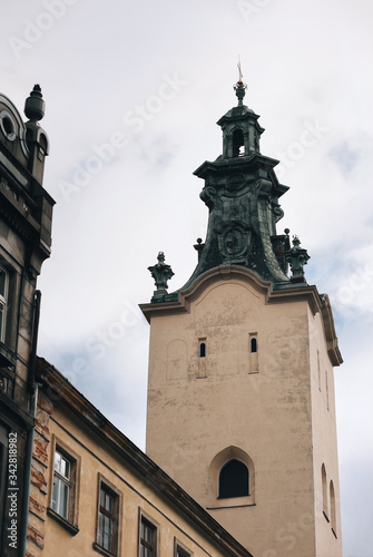 © shchus, Fototapeta premium Tower of the Latin Cathedral of the Assumption of the Virgin Mary in Lviv. Historical part of the city, view from below against the sky.