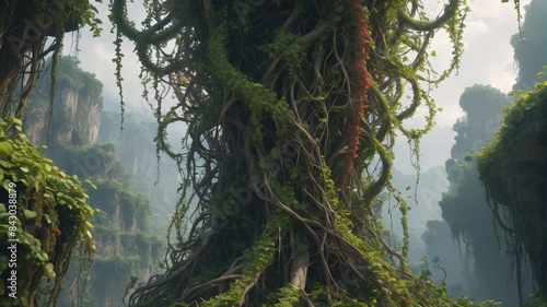 Fototapeta premium Towering above, the monstrous vines twist and writhe, their thorny tendrils...