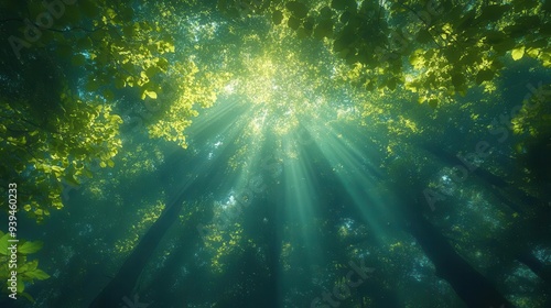 © julija, Obraz premium towering ancient forest canopy viewed from below sunlight filtering through lush green leaves creating a dappled effect misty atmosphere with rays of light