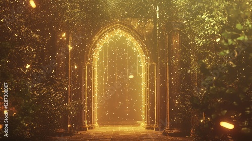 © Jakkarin, Obraz premium Towering Archway Bathed in Warm Twilight Glow Surrounded by Nature