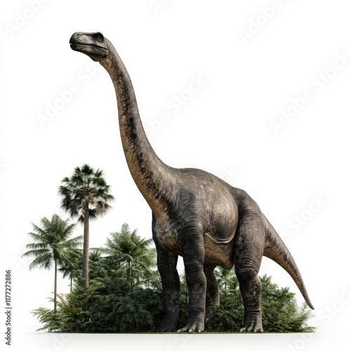 © THAKDANAI, Obraz premium towering Brachiosaurus grazes on treetops, surrounded by lush greenery