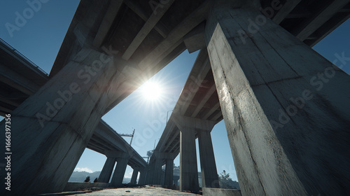 Obraz premium Towering concrete pillars support massive beams under a bright sun with blue...