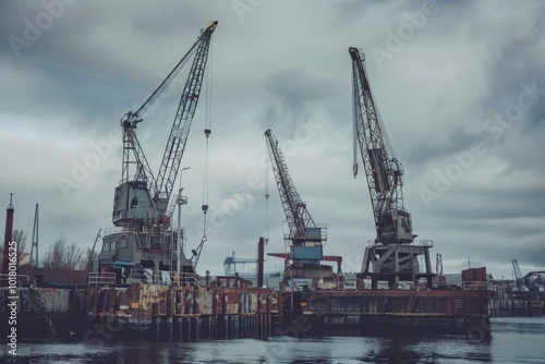 Fototapeta premium Towering cranes dominate a harbor scene under moody skies, evoking strength...