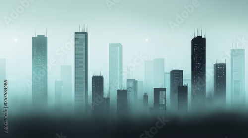 Fototapeta premium towering dystopian futuristic cityscape shrouded in mist, showcasing sleek skyscrapers and mysterious atmosphere