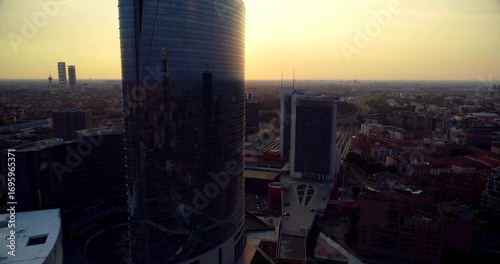 Obraz premium Towering glass skyscraper defining downtown skyline, with office towers, train tracks and roads