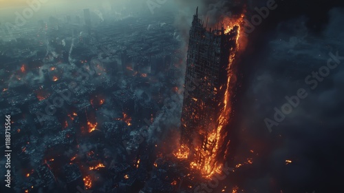 Obraz premium Towering Inferno: Skyscraper Ablaze in a Burning City - made with Generative AI