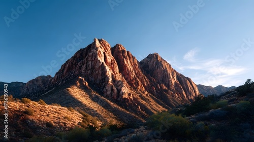 © pkproject, Fototapeta premium Towering, jagged rock formations dominate the arid, rugged desert terrain, creating a dramatic and scenic natural landscape under a bright, cloudless sky.