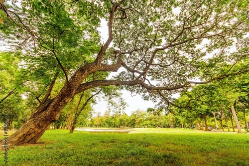 © Purnima, Fototapeta premium "Towering Majesty: Worm's Eye View of a Tall Tree Against a Gray Sky"