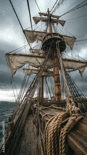 Fototapeta premium Towering medieval ship mast with rigging and sails